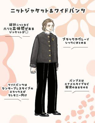 ただし、ニットジャケットは薄手のものだとカジュアルな印象が強まるので、総針ニットなど目がきゅっと詰まったハリのある質感のものを選びましょう。ボタンはパールやビジューといった華やかなデザインボタンだと、よりセレモニコーデに向いています。