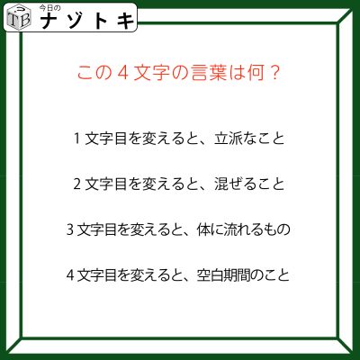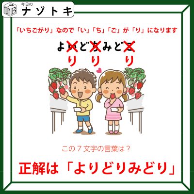 「いちご狩り」が示す謎解きは、「い」「ち」「ご」が「り」になるということです。その上で、先ほどの言葉を変換してみましょう。そうすると「よりどりみどり」となります。正解は「よりどりみどり」でした。