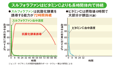 老化を抑える抗酸化物質としてよく知られるのが「ビタミンC」です。タラレー博士の研究では、スルフォラファンの抗酸化力を発揮する時間がビタミンCより長いことが分かりました。ビタミンCとスルフォラファンを比較したところ、ビタミンCは4時間以内に大部分が体外へ排出されるのに対し、スルフォラファンの効果は3日以上も続くことが分かったのです。