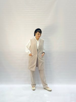 表から見えている左右ポケットの他に左胸の内側にもうひとつポケットが付いています。カラー表記はグレージュですが、グレー味は弱くてほぼベージュという感じでした。顔色が明るく見える色合いだと思います。カラバリはブラック、ネイビー、グレージュの3色で、MとLの2サイズ展開です。