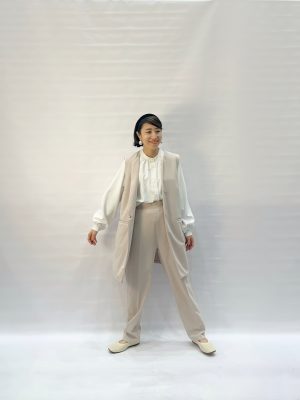 ハレナリージレジャケット(1900円税込)も、縦ラインを強調しつつお尻もカバーする優秀な体型カバーアイテム。抜け感ときちんと感が両立するスリットネックは、合わせるインナーでガラッと印象が変わり、着回し力絶大です。