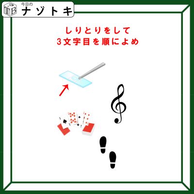 クイズです!「しりとりをして3文字目を順に読みましょう」まずはイラストを言葉に直して【難易度LV4.・辛口】