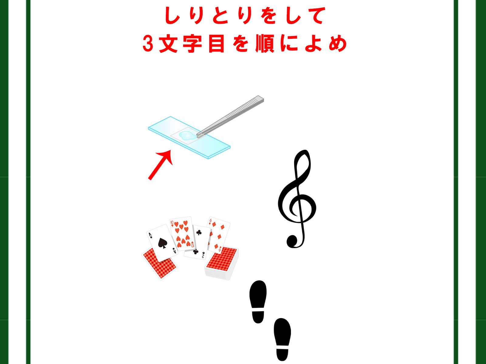 クイズです!「しりとりをして3文字目を順に読みましょう」まずはイラストを言葉に直して【難易度LV4.・辛口】