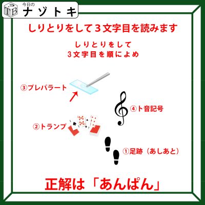 すると①足跡(あしあと)→②トランプ→③プレパラート→ト音記号(とおんきごう)となります。