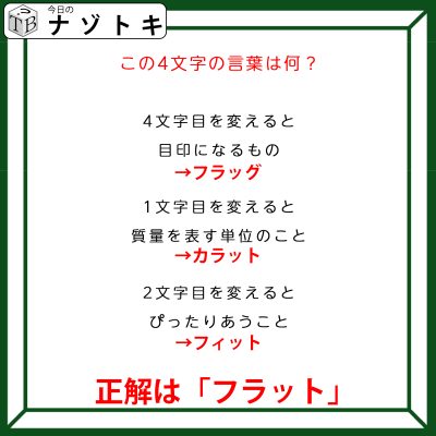 まずは問題文から3つの単語が何かを考えてみましょう。そうするとそれぞれの単語は上から「フラッグ」「カラット」「フィット」であることが分かります。カラットとは宝石等によく使われますね。