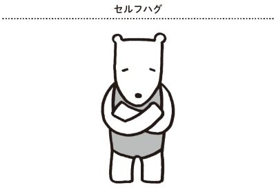 自分自身をハグしてあげるセルフハグもお勧めです。右手で左肩を触れ、左手で右肩を触れてみましょう。触れる肩の位置について、気持ちがいいところを見つけてみてください。肩の上、肩と腕の付け根、上腕、肘、鎖骨付近などを触れてみて、どこが気持ちいいか試してみましょう。
