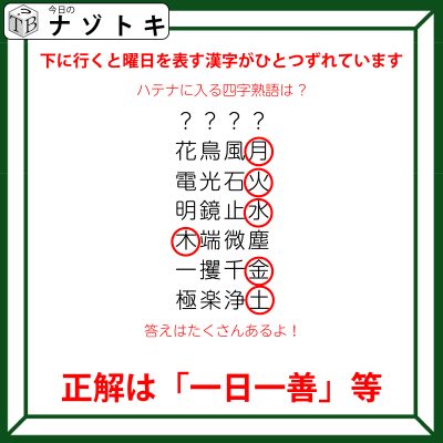 それは曜日です。花鳥風「月」の次は電光石「火」、その次は明鏡止「水」です。この後は割愛しますが曜日が並んでいます。そしてさらにその曜日も順番通りに並んでいるようですね。