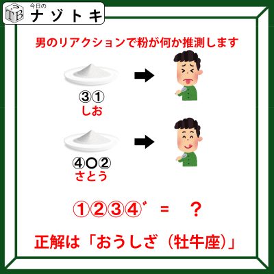男性のリアクションから考えると上の粉はしょっぱそうですね。また、2文字であるということから「しお(塩)」であることが推測できますね。また、下は美味しそう顔をしており、3文字です。そこから塩との対比でもある「さとう(砂糖)」であることが推測できます。