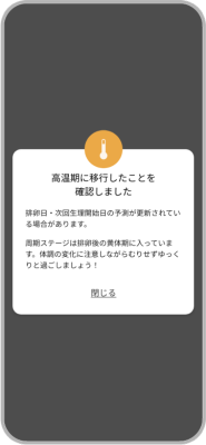周期内で高温期*に移行したタイミングを通知してくれるほか、