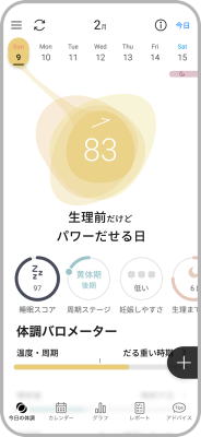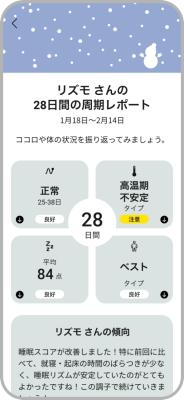 1周期分のデータが蓄積されると、このように、周期全体を通じた状態や体調傾向をレポート形式で教えてもらえます。