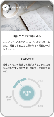 この能動的なモニタリングを続けるうち、「頭痛は月経直前に出やすいのかな」「睡眠の乱れは排卵ごろに気になりやすい?」「肩こりは月経中に起きやすいのかも」と、ご自分のリズムがだんだん腑に落ちてくるんです、と池田先生は言います。そうした気づきが重なることで変化が生まれるきっかけとなるのだそう。