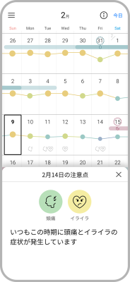 自分でその日の状態をアイコンで選んで細かく入力できるのもリズモならではの機能。続けると、いつどのような体調変化が起きやすいか、あらかじめカレンダーに表示されます。