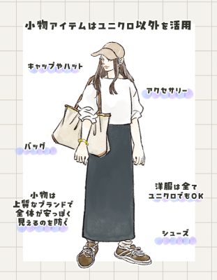 上下ユニクロでおしゃれを作ることはできますが、全身・ALLアイテムユニクロだと少し限界を感じるなといったところが、筆者の正直な感想ですね。なかでも、バッグと靴、アクセサリーには多少の高級感がないと全体的に安っぽく仕上がってしまいます。お洋服の場合は、相場価格が安くても高級感を感じさせる素材というのがあるのでパッと見えで安っぽさをカバーできます。