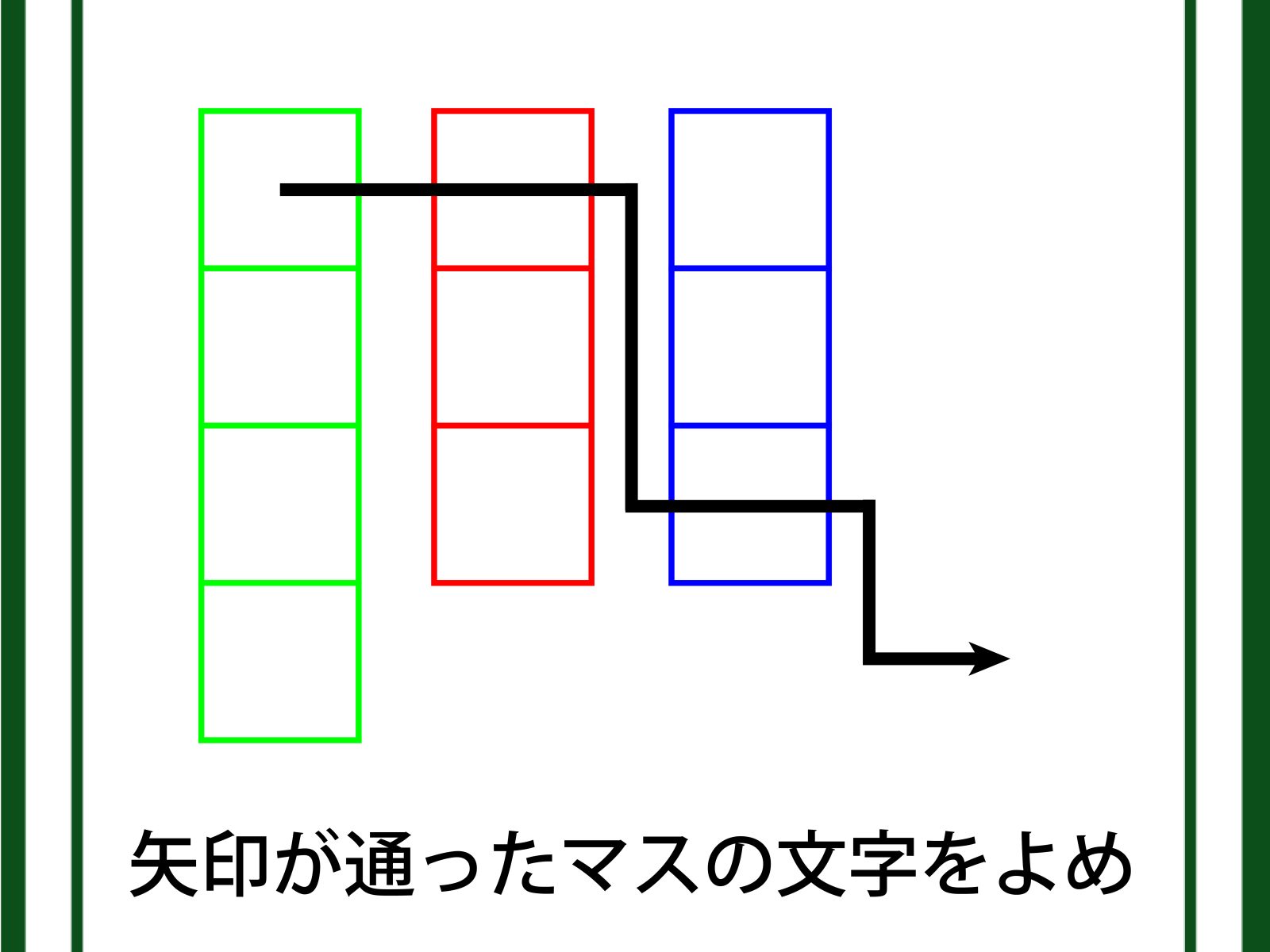 各枠には文字が入ります。それが何か考えましょう。色がポイントです。