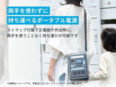 【ポータブル電源】電気も備蓄。停電のとき、あると断然心強い! 照明、携帯の充電のほか、電気毛布などにも使えるバッテリー。車中泊やキャンプにも。肩からかけられるサイズ感がいい♪