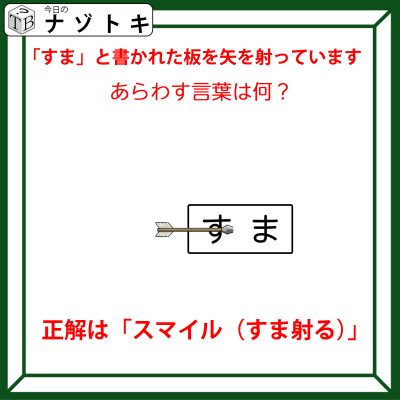 「すま」は「射られている」、「すま」「射る」、ここまでくればわかりますね。そうです!「スマイル」です!というわけで正解は「スマイル」でした。