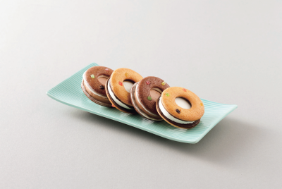 シンボルマークの浮き輪をかたどったクッキーに、チョコとバニラのアイスをサンド