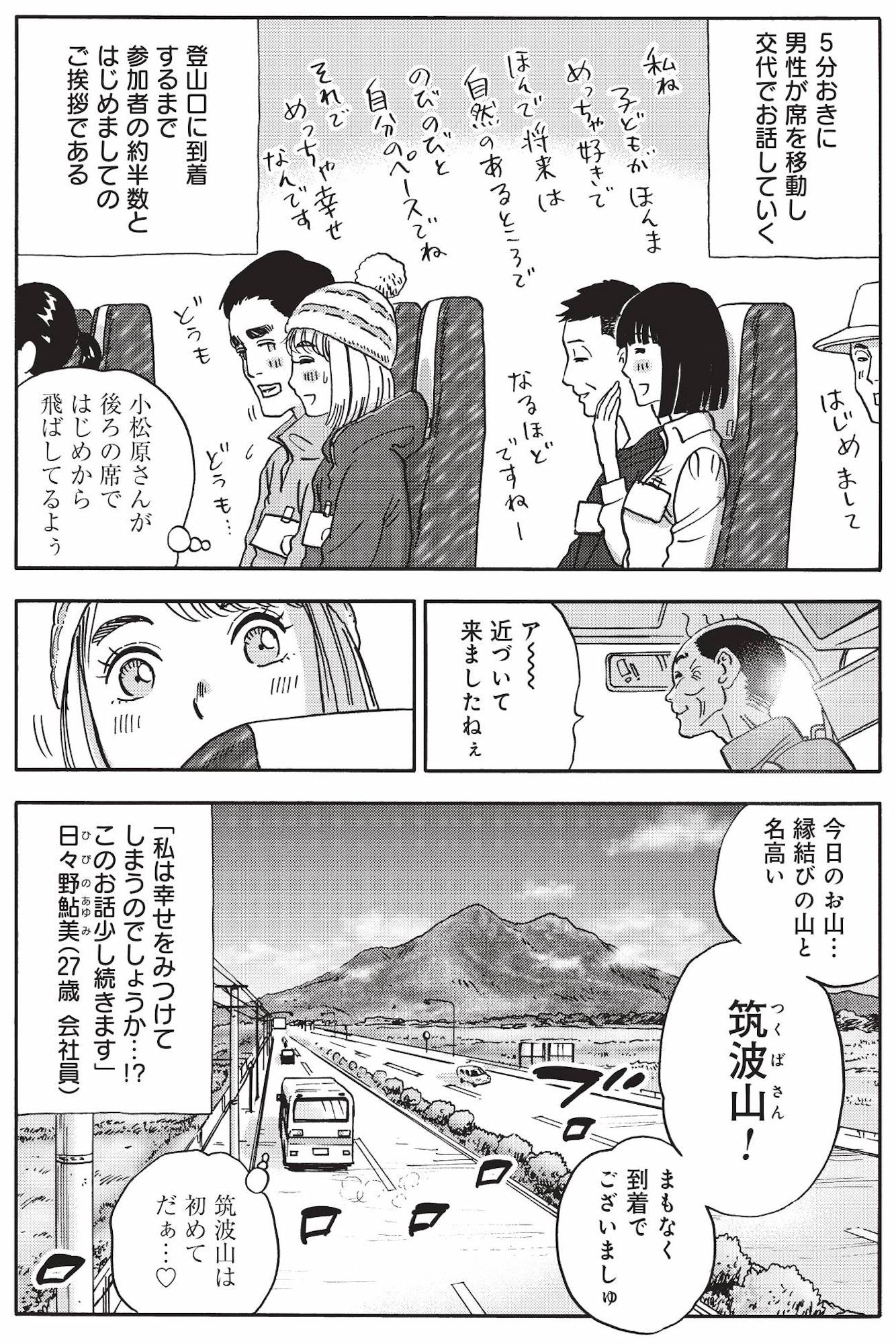 男女がバスに乗り込み、いざ「山コン」出発!説明のあとはドキドキの自己紹介タイム【山と食欲と私 #14】