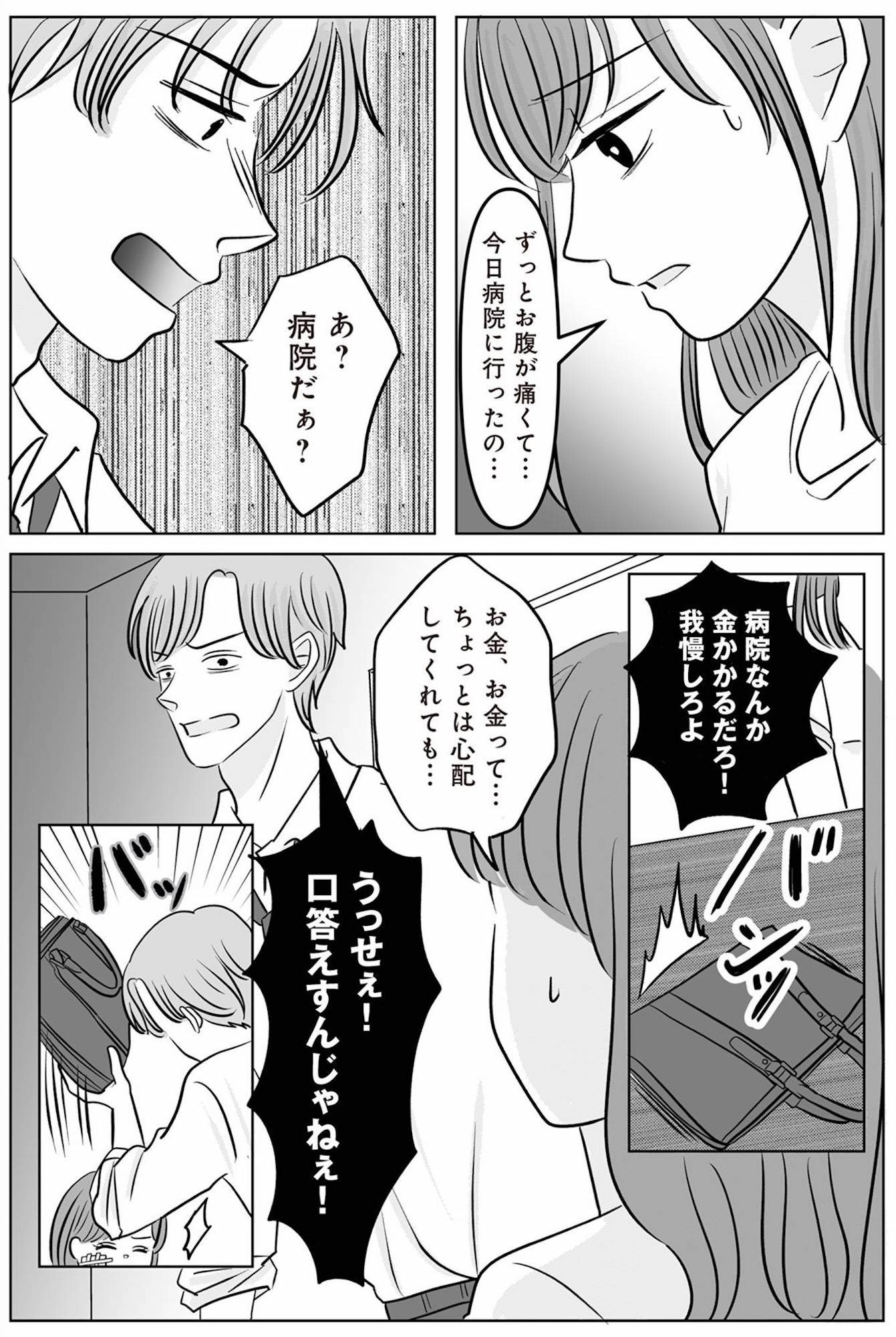 「病院は金がかかる!我慢しろ!」腹痛を訴える妻の体よりも出費を気にする夫【浮気の冤罪 #3】