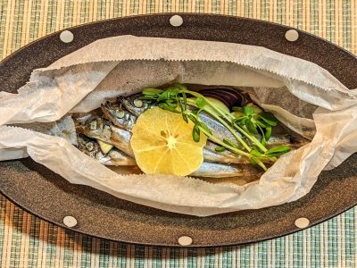これらの“肝の機能にうれしい食材”を使ったおススメレシピの1つ目は「ししゃもとなすのカシス塩麹包み蒸し」です。スーパーの鮮魚コーナーでししゃもを見かける度に「焼き魚以外にどんな食べ方が出来るだろうか?」と思うことが多かったので、今回は「蒸し」調理のレシピにトライしてみました。