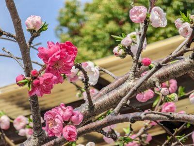 通勤道には花桃の木もあり、毎年鮮やかな色の花を見せてくれます。「とても鮮やかだな」と思って近寄って見ると、白色と桃色の花が同じ枝についていました。「源平咲き」というそうですが、毎年色鮮やかに感じていた理由がわかって清々しい気持ちになりました。
