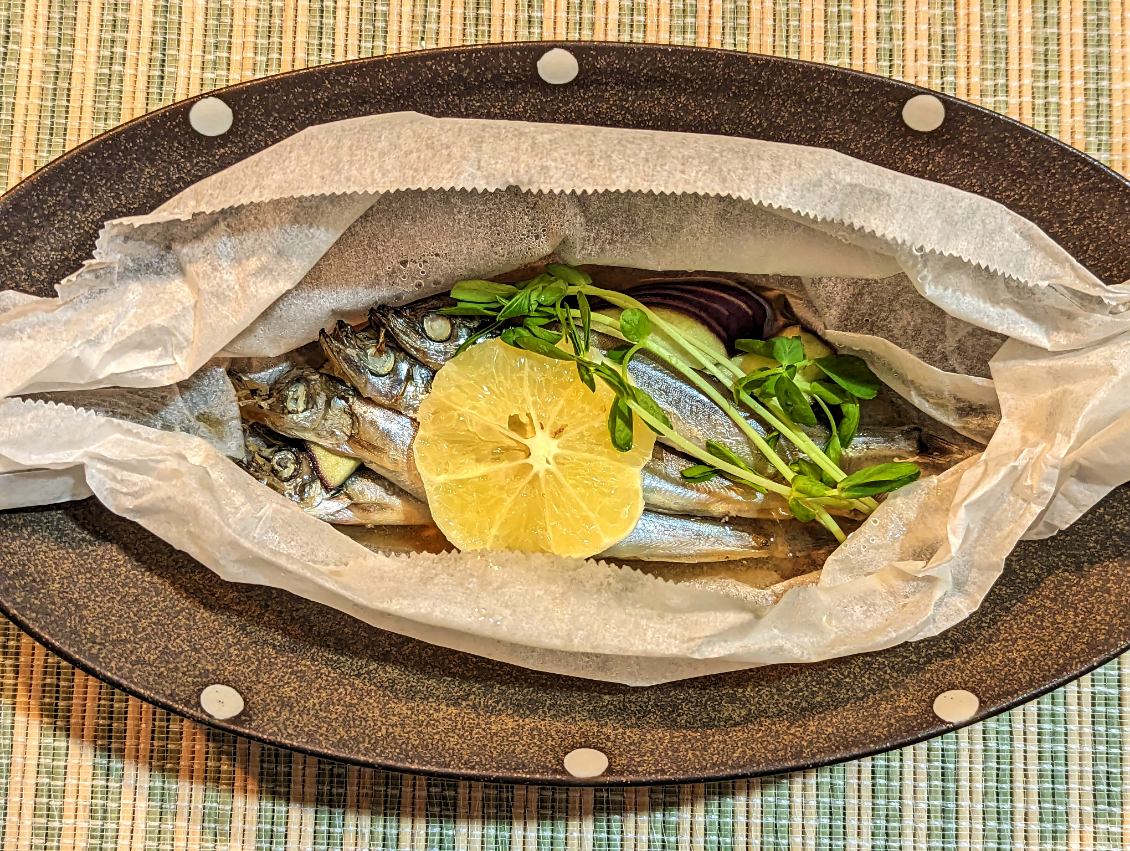 これらの“肝の機能にうれしい食材”を使ったおススメレシピの1つ目は「ししゃもとなすのカシス塩麹包み蒸し」です。スーパーの鮮魚コーナーでししゃもを見かける度に「焼き魚以外にどんな食べ方が出来るだろうか?」と思うことが多かったので、今回は「蒸し」調理のレシピにトライしてみました。