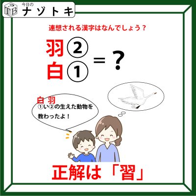あとは答えを考えていきましょう。①②が縦に並んでいますので。実際に「白」と「羽」を縦に並べてみましょう。そうすると、とある漢字に見えてくると思います。そうです!「習」です。というわけで正解は「習」でした。