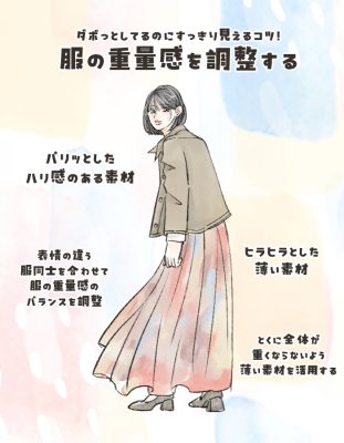 例えば、シャギーニットのカーディガンにコットンギャザーのロングスカートなど、どちらもゆったりしたシルエットですが服の重量感が違うので着こなしにメリハリが出来ています。上下どちらかは重そう・硬そうな服、一方は柔らかそう、ツヤ感や透け感がある服を選ぶと良いですね。