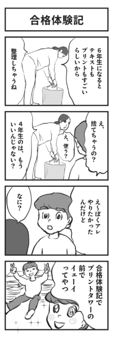 ――なるほど。分類が苦手な身としては、床の箱に直置き派もいると知って安心しました。漫画でも、息子のさい君が「合格体験記でプリントタワーの前でイェーイってやりたい」と言っていて、「かわいいなぁ」と癒やされました!