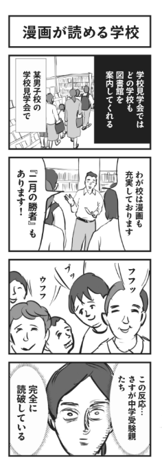 ――漫画の中で、学校見学会の図書室に中学受験漫画『二月の勝者 ー絶対合格の教室ー』(小学館)があると聞き、読破しているであろう「中受親」が「フフッ」と笑うシーンがありますが、あの漫画も非常に勉強になりました。中学受験の偏差値と、高校受験や大学受験の偏差値が大きく異なることも、あの漫画で学びました。