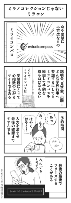 また、「ミラノコレクションじゃないミラコン」という章に描かれていた、「mirai-compass(ミライコンパス)フリーズ問題」は、首がもげそうなほど頷きました。