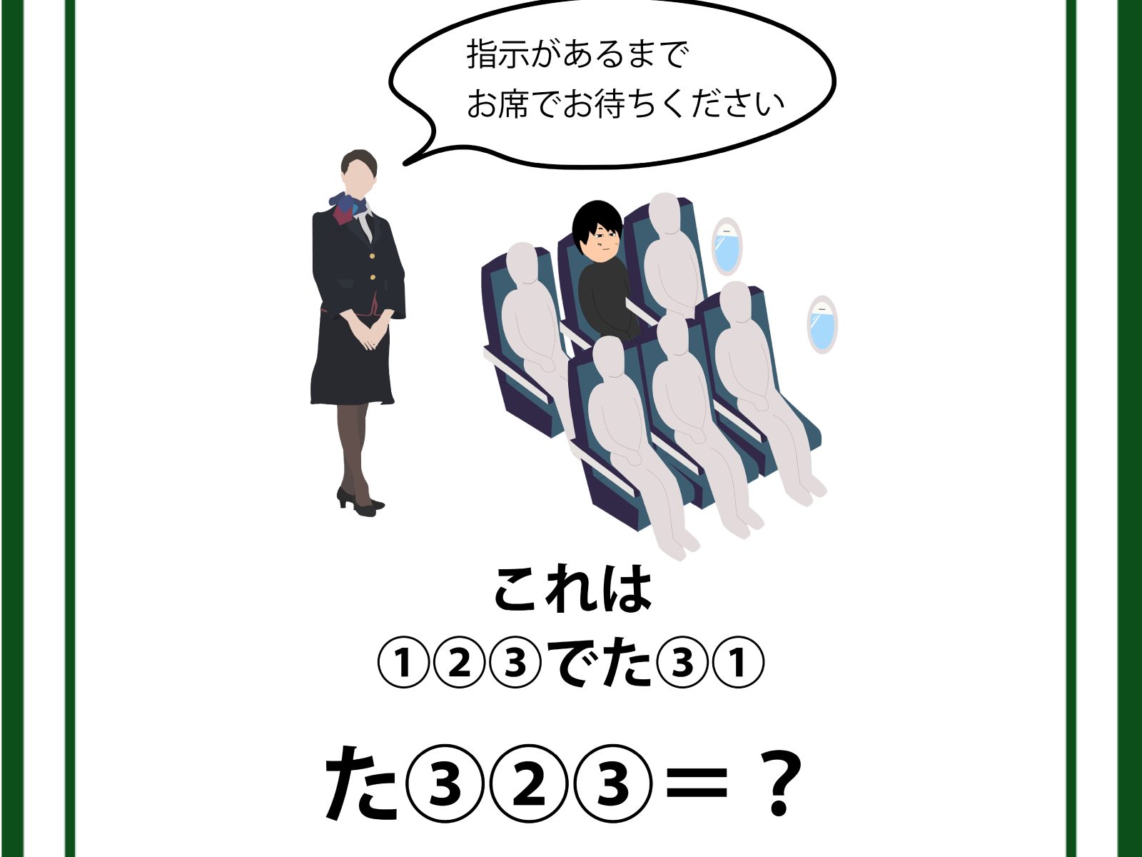 クイズです!「指示があるまでお席でお待ちください」イラストを言葉に直してみましょう【難易度LV2.・甘口】