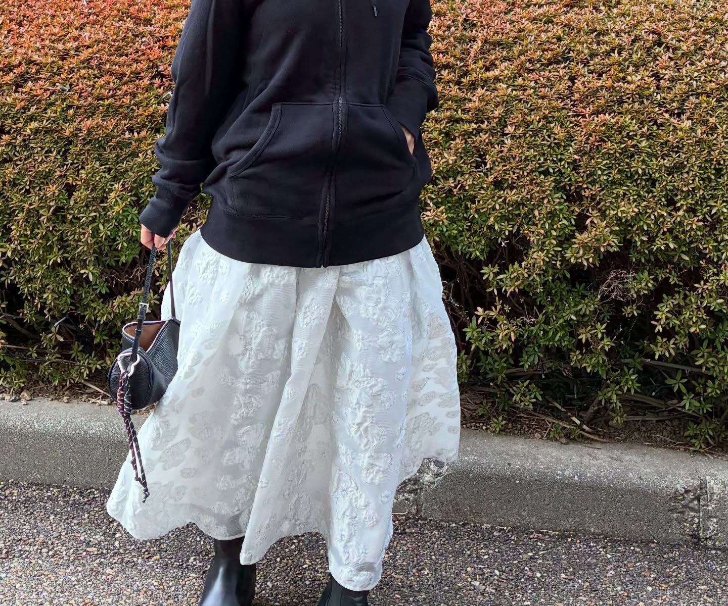 たまにはスカートを穿きたいけれど、気負いすぎたくないランチの日。ailiretyさんは、ユニクロの「スウェットオーバーサイズフルジップパーカ」4,990円(162cmでサイズM着用)を合わせることで、甘くなりがちなフレアスカートを程よくカジュアルに引き寄せています。モノトーンでまとめることで、ふんわりとした素材感のスカートも洗練された印象に。足元にはボリュームのある黒のブーツを添えて、全体のシルエットに重厚感を持たせつつ脚長効果も抜かりなく。