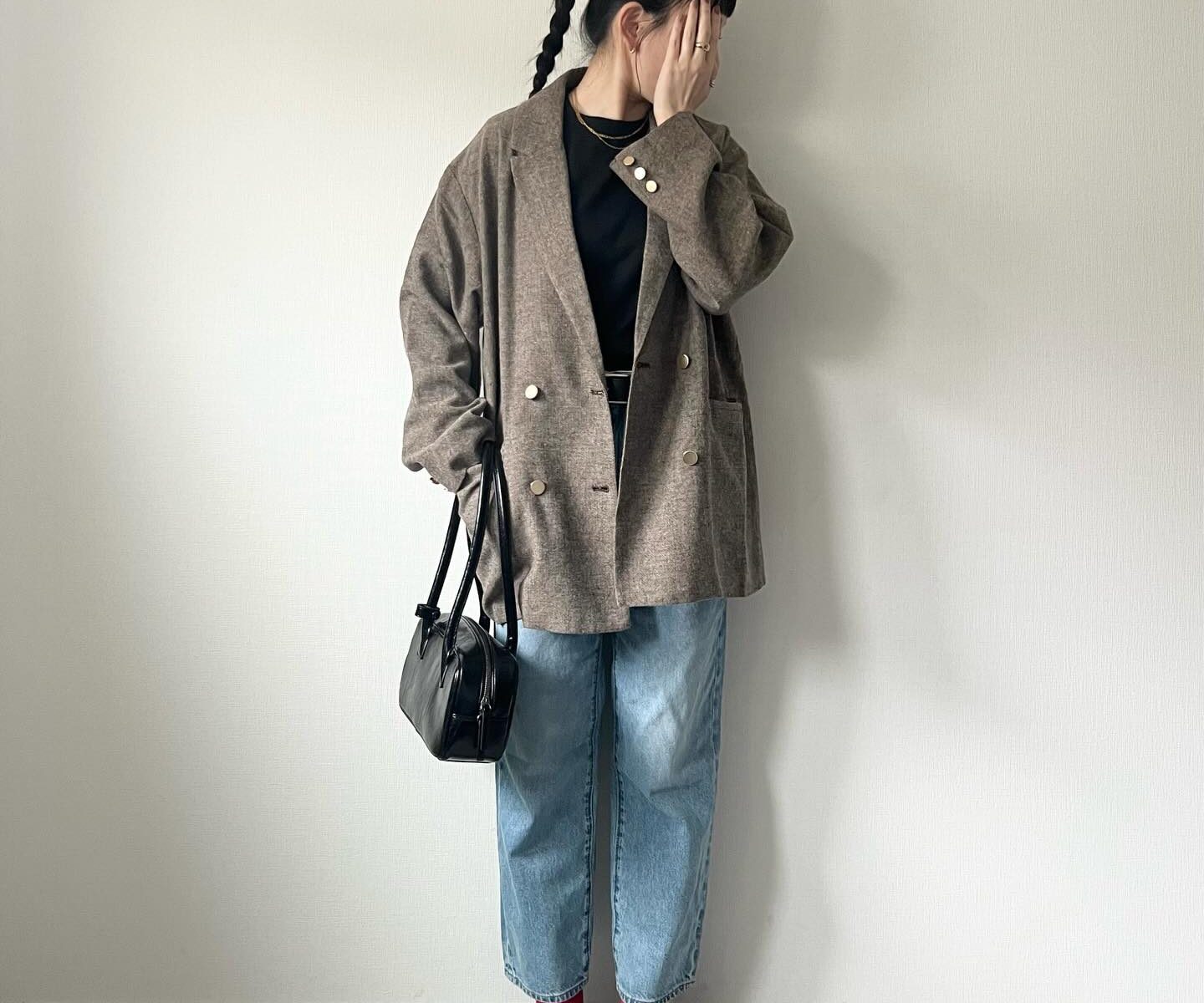 季節の変わり目に悩みがちなアウター選びですが、今季はオーバーサイズのジャケットが頼りになります。ko.wearさんは、ブラウンのダブルジャケットに、ユニクロの「クルーネックTシャツ」1,500円(160cmでサイズS着用)とGUの「ストレートアンクルジーンズ」2,990円(160cmでサイズ不明)をコーディネート。一見ベーシックなトラッドスタイルですが、足元からGUの「リブパイルアンクルソックス」値下げで190円の赤をチラリとのぞかせているのがおしゃれ。