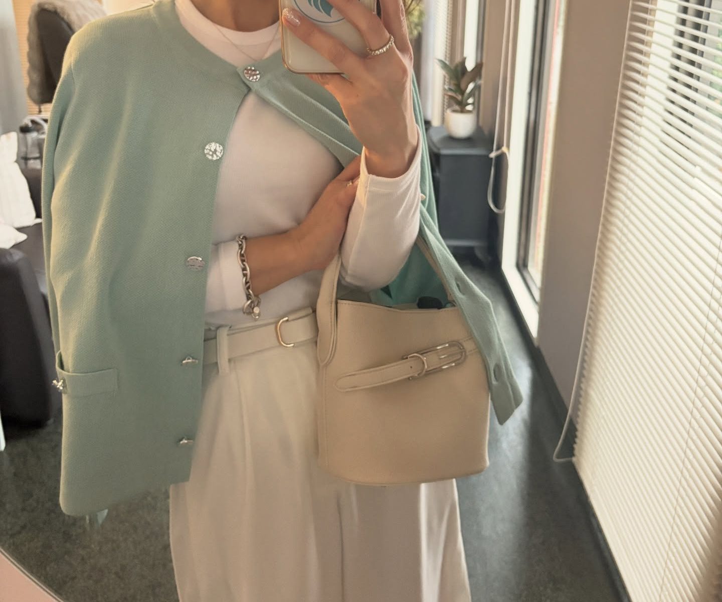 慌ただしい季節こそ、目から入る色彩で気分をリフレッシュしたいもの。midopeiさんは、ユニクロの「ソフトリブクルーネックT」1,990円(158cmでサイズS着用)をインナーに使い、春らしいミントグリーンのカーディガンをさらりと肩掛け。膨張しがちなホワイトのワントーンに、清潔感のある淡いカラーを重ねることで、全体の印象がぐっと引き締まります。