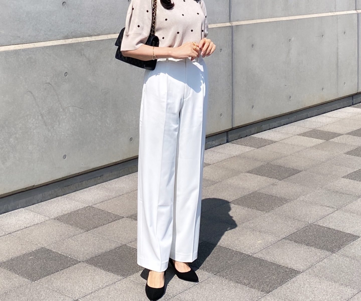 ドット柄×【ユニクロ】白パンツ。初夏に映える爽やかな着こなし【40代の毎日コーデ】