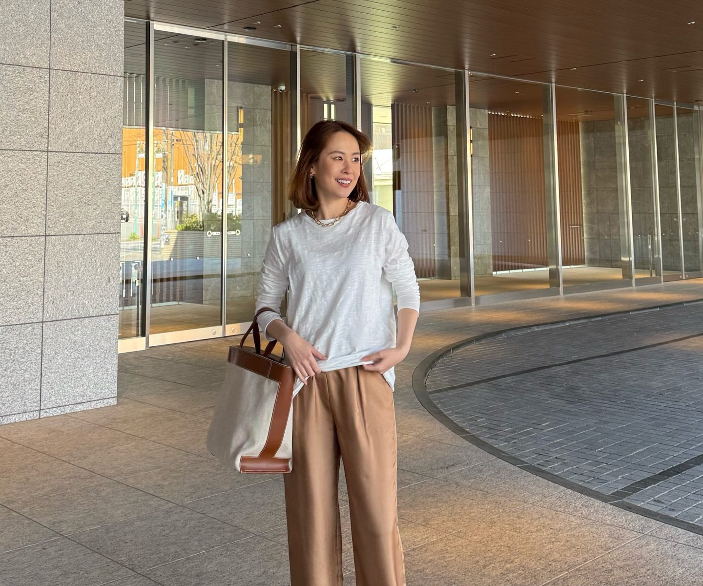 白ロンTはスラブ素材で表情豊かに。×キャメルパンツを合わせた軽やかスタイル。【40代の毎日コーデ】