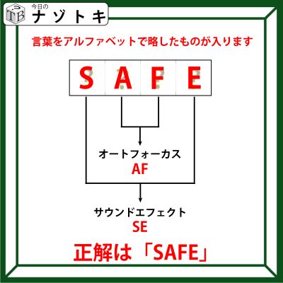 それはそれぞれの単語をアルファベットで略すことです。つまり、「オートフォーカス」なら「AF」と略すことができ、「サウンドエフェクト」なら「SE」と略すことができます。あとは枠に当てはまるようにアルファベットを並べていきましょう。正解は「SAFE」でした。