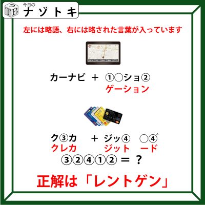 あとは、下のイラストも考えてみましょう。下のイラストは「クレジットカード」です。略して「クレカ」です。つまり、「クレカ」がすぐ下の左側に入りそうです。略された「ジット、-ド」が入りそうです。