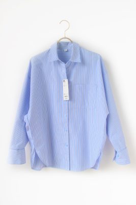 GUで見つけたドルマンスリーブストライプシャツは、サイズがXS〜3XLと7サイズ。ちょうどいい着丈が選べました!身幅はゆったりしていて、モモンガのような袖の形ですが、着ると袖のデザインはそんなに主張しません。
