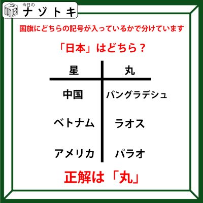 クイズです!「日本はどちら?」星と丸の下にある国名から共通点を考えましょう【難易度LV2.・甘口】
