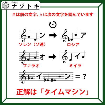 音階と記号の意味を考えるナゾトキでした。各音階の文字と、並んでいる文字を読むことで単語になります。なので例示の左側の読み方は「ソレン(ソ連)」「ファラオ」です。矢印は時間経過を表しており、「ソレン(ソ連)」は「ロシア」となり、「ファラオ」は「ミイラ」となっています。「レ」にくっついている♭はくっついた音階の文字の五十音での次の文字を読んでいます。あとは問題を解いていきましょう。問題には♯もありますが♭が次の文字なら♯は一つ前の文字を読むことが推測できますね。そのことも踏まえて読んでいきましょう。正解は「タイムマシン」でした。