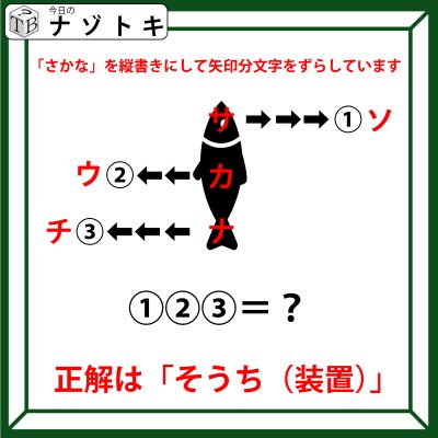 イラストから答えを考えるナゾトキでした。真ん中のイラストは「さかな」を表します。それを縦書きにすると上図のようになりますのでそこから矢印分文字をずらしていることが推測することができます。つまり、「サ」は右に3つずらした先の文字になるため「ソ」となります。「カ」は左に2つずらしたその先の文字のため「ウ」。「ナ」は左に3つずらしたさらにその先なので「チ」ということになります。あとは順に文字を読んでいきましょう。正解は「そうち(装置)」でした。