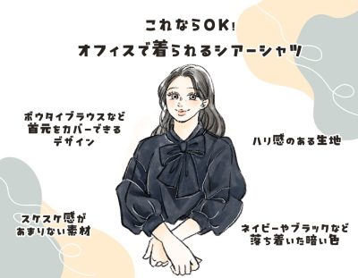 おすすめしたいのはハリ感のある素材のボウタイシャツです。適度なシャリ・ハリ感があるシアーシャツは、シルエットに立体的感が生まれるため素材が透けていても素肌が目立ちにくいという特徴があります。シャツの色は基本的にどんなものでもOKですが、よりオフィスらしさやきちんと感、肌見せを極力防ぐなら、グレー・ダークブラウン・ネイビーといったシックな色合いのシアーシャツを取り入れてください。シアーシャツはシャツの色が暗いほどに透け感が目立ちにくいです。