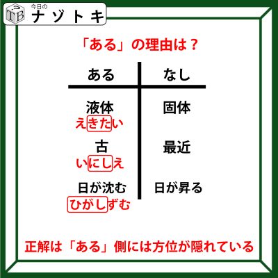「ある」の理由を考えるあるなしクイズでした。まずはそれぞれの言葉をひらがなに直してみましょう。すると「えきたい」「いにしえ」「ひがしずむ」となります。この3つの言葉には共通したとあるジャンルの言葉が含まれているのですが分かりましたでしょうか?