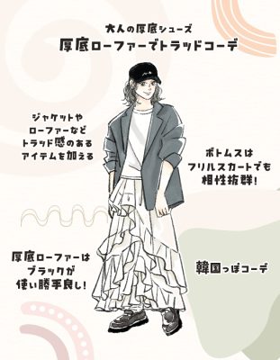 しかも、ローファーなら服装のテイストがフェミニンでも、カジュアルでも、モードでも対応できちゃう!いろんなテイストのファッションを楽しみたい方こそ、実はスニーカーよりも、ローファーをおすすめしていますね。とくにローファーはグレーや黒、白でまとめたモノトーンコーデと相性が良いです。足元を厚底ローファーにするだけで、韓国っぽコーデっぽさも出てくるので、ぜひ取り入れてみてくださいね。