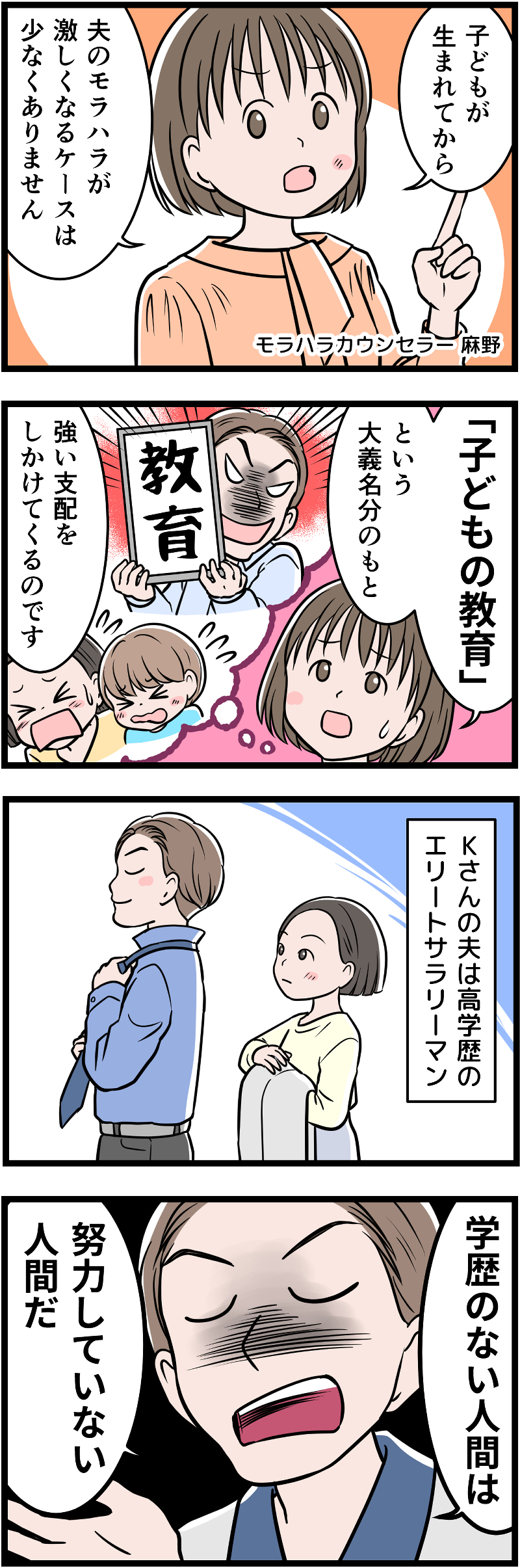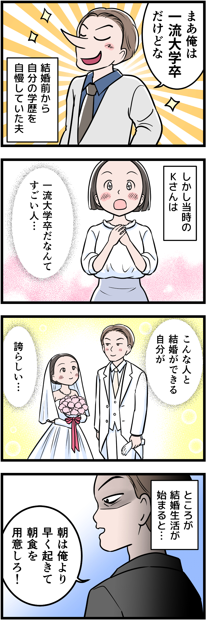 高学歴でエリートサラリーマンの彼の口癖は、「学歴のない人間は、努力をしていない」。結婚前から、ことあるごとに学歴を自慢していたそうですが、当時のKさんはむしろ「そうなんだ、すごい」と感心してしまったのです。