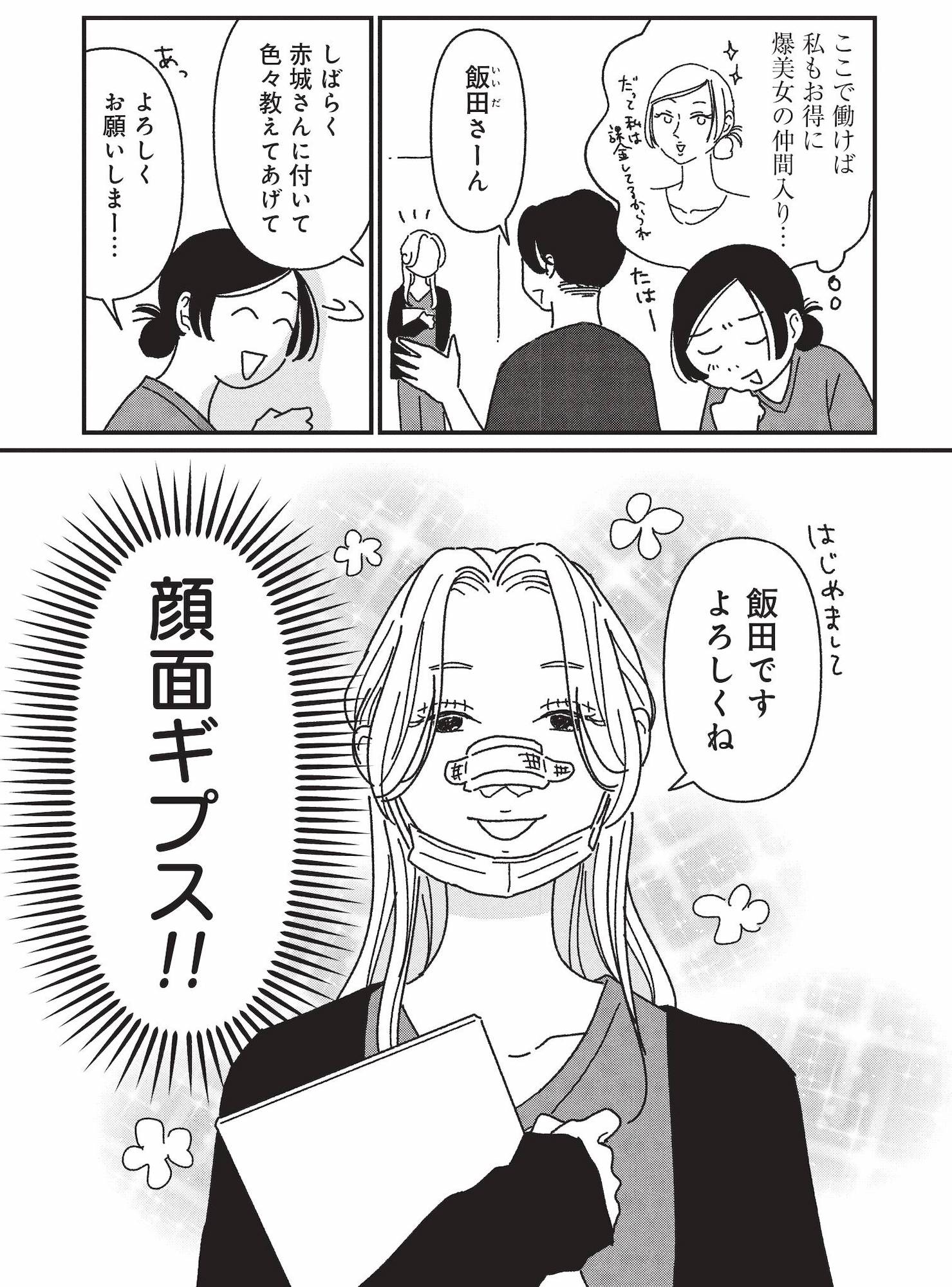 「社割で美容代がお得になる」という甘い言葉に惹かれて働き始めたものの、待っていたのは顔面ギプス姿の先輩や、アニメキャラの顔を目指す患者、社長が連れてくる大量のキャバ嬢たち……。