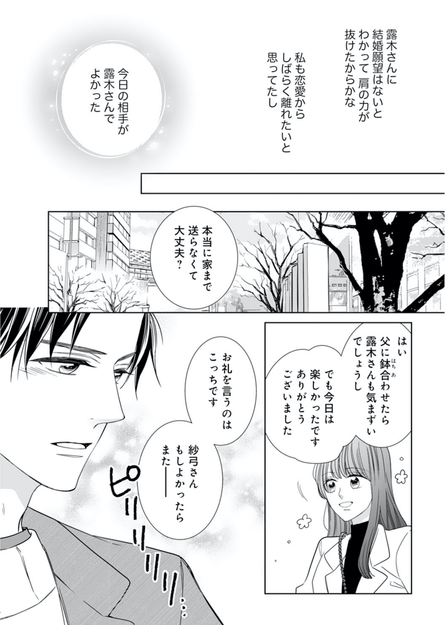 パイロットの元恋人に裏切られた過去から縁談を断るつもりだったが、待ち合わせの場で露木も結婚する気がないと知り、ひと安心する。