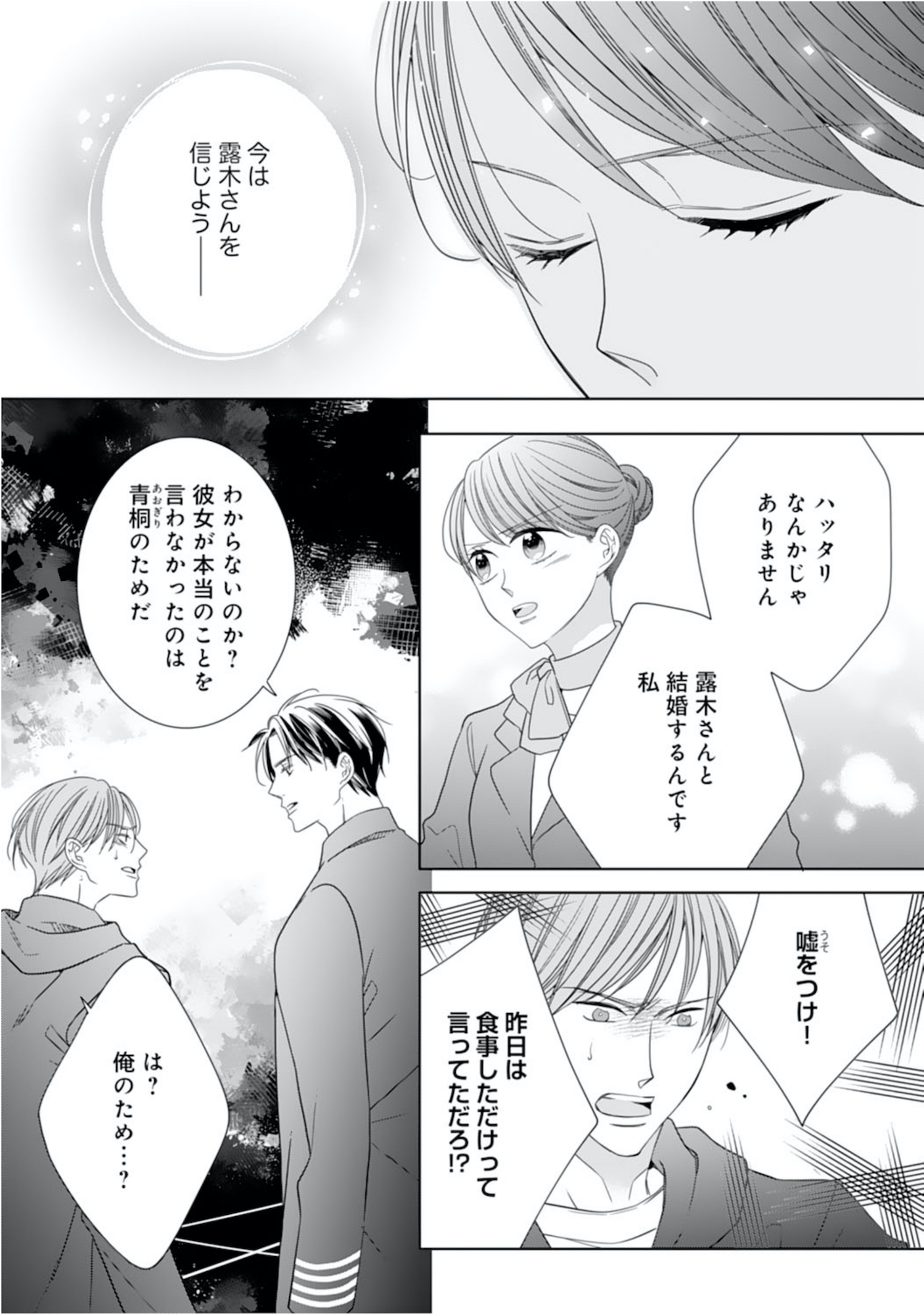 パイロットの元恋人に裏切られた過去から縁談を断るつもりだったが、待ち合わせの場で露木も結婚する気がないと知り、ひと安心する。